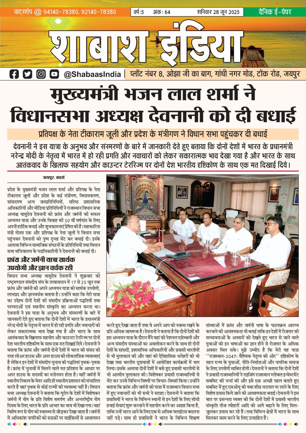 ePaper 28 June 2025 By shabaasindia June 28, 2025 0 77 Share FacebookTwitterPinterestWhatsApp 28-June-SI-Newspaper Related TagsFourth Featuresnews Share FacebookTwitterPinterestWhatsApp Previous article24 June 2025Next articleसीमाओं और सियासत से परे एक राजनयिक की जंग – एक बेगुनाह को बचाने की कोशिश – ‘द डिप्लोमेट’ सिर्फ सोनी मैक्स पर - Advertisement - LEAVE A REPLY Cancel reply Comment: Please enter your comment! Name:* Please enter your name here Email:* You have entered an incorrect email address! Please enter your email address here Website: Save my name, email, and website in this browser for the next time I comment. Δ Latest article सटीक डायग्नोसिस ने दूर की भ्रांति, फीटल मेडिसिन विशेषज्ञ डॉ. आशीष चौधरी की जांच में स्पष्ट हुई शिशु की वास्तविक स्थिति March 1, 2026 भक्ति, एकता और अनुशासन का संगम: सावरदा में महासमिति का छठा मासिक पूजन विधान संपन्न February 28, 2026 सावरदा सिद्ध क्षेत्र में उमड़ा भक्ति का सैलाब: महासमिति का छठा मासिक पूजन विधान संपन्न February 24, 2026 शिवम दुबे का ‘हरफनमौला’ प्रहार: करियर का पहला विश्वकप अर्धशतक जड़ा; वरुण चक्रवर्ती की फिरकी में उलझी डच टीम February 18, 2026 भक्ति और उल्लास के साथ नव वर्ष का स्वागत: स्वस्तिक ग्रुप ने चूल्हिरी मंदिर में की पूजा-अर्चना February 4, 2026