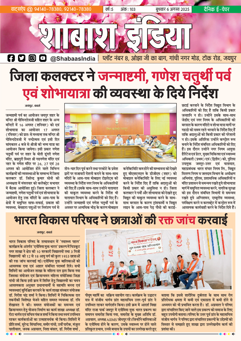ePaper 6 Aug 2025 By shabaasindia August 6, 2025 0 122 Share FacebookTwitterPinterestWhatsApp 6-Aug-SI-Newspaper Related TagsFourth Featuresnews Share FacebookTwitterPinterestWhatsApp Previous article4 Aug 2025Next articleपांड्या परिवार द्वारा श्रमण संस्कृति संस्थान के बालकों को भोजन करवाया - Advertisement - LEAVE A REPLY Cancel reply Comment: Please enter your comment! Name:* Please enter your name here Email:* You have entered an incorrect email address! Please enter your email address here Website: Save my name, email, and website in this browser for the next time I comment. Δ Latest article सटीक डायग्नोसिस ने दूर की भ्रांति, फीटल मेडिसिन विशेषज्ञ डॉ. आशीष चौधरी की जांच में स्पष्ट हुई शिशु की वास्तविक स्थिति March 1, 2026 भक्ति, एकता और अनुशासन का संगम: सावरदा में महासमिति का छठा मासिक पूजन विधान संपन्न February 28, 2026 सावरदा सिद्ध क्षेत्र में उमड़ा भक्ति का सैलाब: महासमिति का छठा मासिक पूजन विधान संपन्न February 24, 2026 शिवम दुबे का ‘हरफनमौला’ प्रहार: करियर का पहला विश्वकप अर्धशतक जड़ा; वरुण चक्रवर्ती की फिरकी में उलझी डच टीम February 18, 2026 भक्ति और उल्लास के साथ नव वर्ष का स्वागत: स्वस्तिक ग्रुप ने चूल्हिरी मंदिर में की पूजा-अर्चना February 4, 2026