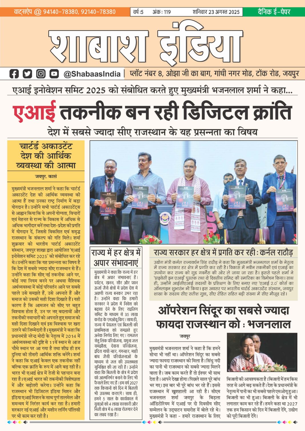 ePaper 23 Aug 2025 By shabaasindia August 23, 2025 0 56 Share FacebookTwitterPinterestWhatsApp 23-Aug-SI-Newspaper Related TagsFourth Features Share FacebookTwitterPinterestWhatsApp Previous article20 Aug 2025Next article25 Aug 2025 - Advertisement - LEAVE A REPLY Cancel reply Comment: Please enter your comment! Name:* Please enter your name here Email:* You have entered an incorrect email address! Please enter your email address here Website: Save my name, email, and website in this browser for the next time I comment. Δ Latest article सटीक डायग्नोसिस ने दूर की भ्रांति, फीटल मेडिसिन विशेषज्ञ डॉ. आशीष चौधरी की जांच में स्पष्ट हुई शिशु की वास्तविक स्थिति March 1, 2026 भक्ति, एकता और अनुशासन का संगम: सावरदा में महासमिति का छठा मासिक पूजन विधान संपन्न February 28, 2026 सावरदा सिद्ध क्षेत्र में उमड़ा भक्ति का सैलाब: महासमिति का छठा मासिक पूजन विधान संपन्न February 24, 2026 शिवम दुबे का ‘हरफनमौला’ प्रहार: करियर का पहला विश्वकप अर्धशतक जड़ा; वरुण चक्रवर्ती की फिरकी में उलझी डच टीम February 18, 2026 भक्ति और उल्लास के साथ नव वर्ष का स्वागत: स्वस्तिक ग्रुप ने चूल्हिरी मंदिर में की पूजा-अर्चना February 4, 2026