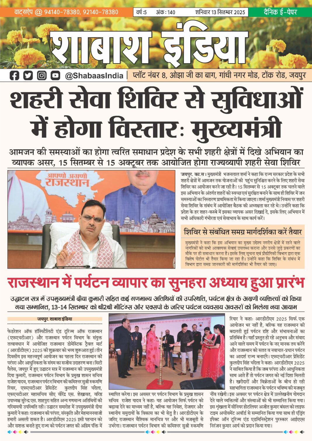 ePaper 13 Sep 2025 By shabaasindia September 13, 2025 0 55 Share FacebookTwitterPinterestWhatsApp 13-Sep-SI-Newspaper Related TagsFourth FeaturesOther Features Share FacebookTwitterPinterestWhatsApp Previous articleजयपुर में जनवरी में लगेगा विद्वानों का जमावड़ा, 14 हजार में मिलेगी खास अनुभवNext article19 Sep 2025 - Advertisement - LEAVE A REPLY Cancel reply Comment: Please enter your comment! Name:* Please enter your name here Email:* You have entered an incorrect email address! Please enter your email address here Website: Save my name, email, and website in this browser for the next time I comment. Δ Latest article सटीक डायग्नोसिस ने दूर की भ्रांति, फीटल मेडिसिन विशेषज्ञ डॉ. आशीष चौधरी की जांच में स्पष्ट हुई शिशु की वास्तविक स्थिति March 1, 2026 भक्ति, एकता और अनुशासन का संगम: सावरदा में महासमिति का छठा मासिक पूजन विधान संपन्न February 28, 2026 सावरदा सिद्ध क्षेत्र में उमड़ा भक्ति का सैलाब: महासमिति का छठा मासिक पूजन विधान संपन्न February 24, 2026 शिवम दुबे का ‘हरफनमौला’ प्रहार: करियर का पहला विश्वकप अर्धशतक जड़ा; वरुण चक्रवर्ती की फिरकी में उलझी डच टीम February 18, 2026 भक्ति और उल्लास के साथ नव वर्ष का स्वागत: स्वस्तिक ग्रुप ने चूल्हिरी मंदिर में की पूजा-अर्चना February 4, 2026
