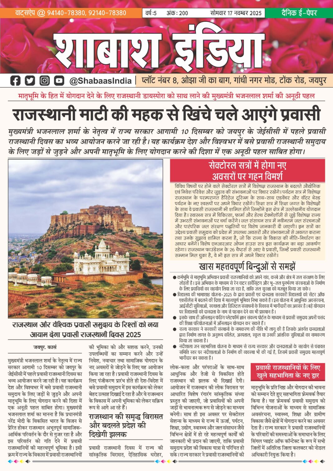 ePaper 17 Nov 2026 By shabaasindia November 16, 2025 0 0 Share FacebookTwitterPinterestWhatsApp 17-Nov-SI-Newspaper Related TagsFourth Features Share FacebookTwitterPinterestWhatsApp Previous article16 Nov 2025Next articleसमस्त भारत की जैन समाज के लिए रचनात्मक संदेश किशनगढ़ की धरती से - Advertisement - LEAVE A REPLY Cancel reply Comment: Please enter your comment! Name:* Please enter your name here Email:* You have entered an incorrect email address! Please enter your email address here Website: Save my name, email, and website in this browser for the next time I comment. Δ Latest article सटीक डायग्नोसिस ने दूर की भ्रांति, फीटल मेडिसिन विशेषज्ञ डॉ. आशीष चौधरी की जांच में स्पष्ट हुई शिशु की वास्तविक स्थिति March 1, 2026 भक्ति, एकता और अनुशासन का संगम: सावरदा में महासमिति का छठा मासिक पूजन विधान संपन्न February 28, 2026 सावरदा सिद्ध क्षेत्र में उमड़ा भक्ति का सैलाब: महासमिति का छठा मासिक पूजन विधान संपन्न February 24, 2026 शिवम दुबे का ‘हरफनमौला’ प्रहार: करियर का पहला विश्वकप अर्धशतक जड़ा; वरुण चक्रवर्ती की फिरकी में उलझी डच टीम February 18, 2026 भक्ति और उल्लास के साथ नव वर्ष का स्वागत: स्वस्तिक ग्रुप ने चूल्हिरी मंदिर में की पूजा-अर्चना February 4, 2026