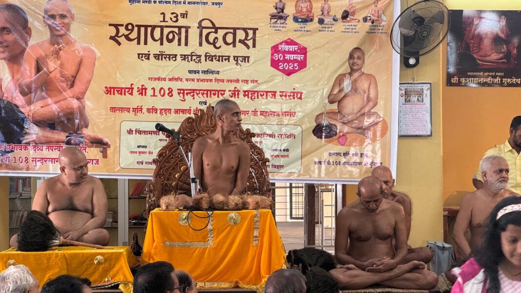 जयपुर। पारस विहार मुहाना मंडी के चिंतामणि पार्श्वनाथ दिगम्बर जैन मंदिर में विराजित 300 वर्ष प्राचीन पार्श्वनाथ भगवान की प्रतीमा का 13 वां वार्षिक स्थापना दिवस परम प्रभावक, दिव्य तपस्वी, राष्ट्र संत आचार्य श्री 108 सुंदर सागर जी महाराज संसंघ एवं आचार्य श्री 108 शशांक सागर जी महाराज के सानिध्य में बड़े हर्षोल्लास से मनाया गया। अध्यक्ष पवन कुमार गोदिका ने बताया कि आचार्य श्री 108सुंदर सागर जी महाराज संसंघ का 30.11.25 को प्रातः 7.00 बजे एस. एफ. एस. जैन समाज/चित्रकूट कालोनी जैन समाज की सहभागिता से एसएफएस मंदिर से विहार कर प्रातः 8.00 बजे बोनी हाइट सोसाइटी गेट नंबर 3 मुहाना मंडी पर पहुंचे कोषाध्यक्ष विरेन्द्र के सेठी व संरक्षक संतोष सडूवाले एवं समाज के सभी साधर्मी बंधुओं ने अगवानी की एवं आचार्य श्री का पादपक्षालण किया गया।