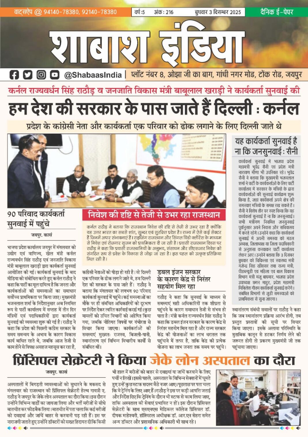 ePaper 3 Dec 2025 By shabaasindia December 3, 2025 0 0 Share FacebookTwitterPinterestWhatsApp 3-Dec-SI-Newspaper Related TagsFourth Features Share FacebookTwitterPinterestWhatsApp Previous articleदिल्ली में हर सांस धीमा जहर, सिगरेट नहीं पी, फिर भी फेफड़ों का कैंसर!Next article7 Dec 2025 - Advertisement - LEAVE A REPLY Cancel reply Comment: Please enter your comment! Name:* Please enter your name here Email:* You have entered an incorrect email address! Please enter your email address here Website: Save my name, email, and website in this browser for the next time I comment. Δ Latest article सटीक डायग्नोसिस ने दूर की भ्रांति, फीटल मेडिसिन विशेषज्ञ डॉ. आशीष चौधरी की जांच में स्पष्ट हुई शिशु की वास्तविक स्थिति March 1, 2026 भक्ति, एकता और अनुशासन का संगम: सावरदा में महासमिति का छठा मासिक पूजन विधान संपन्न February 28, 2026 सावरदा सिद्ध क्षेत्र में उमड़ा भक्ति का सैलाब: महासमिति का छठा मासिक पूजन विधान संपन्न February 24, 2026 शिवम दुबे का ‘हरफनमौला’ प्रहार: करियर का पहला विश्वकप अर्धशतक जड़ा; वरुण चक्रवर्ती की फिरकी में उलझी डच टीम February 18, 2026 भक्ति और उल्लास के साथ नव वर्ष का स्वागत: स्वस्तिक ग्रुप ने चूल्हिरी मंदिर में की पूजा-अर्चना February 4, 2026