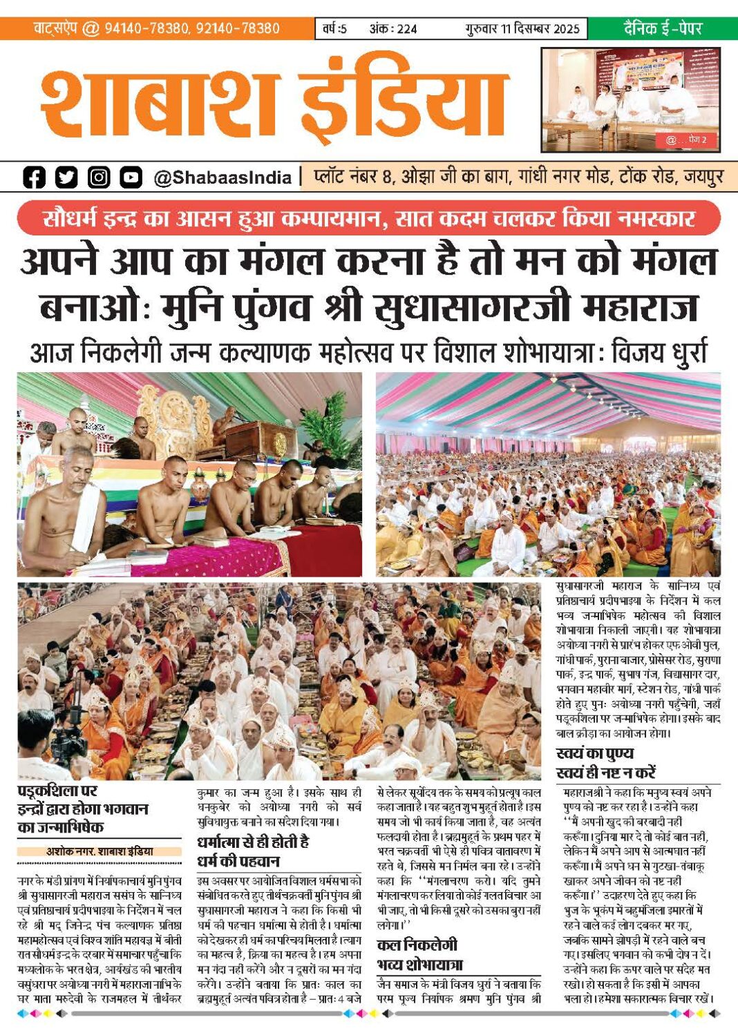 ePaper 11 Dec 2025 By shabaasindia December 10, 2025 0 0 Share FacebookTwitterPinterestWhatsApp 11-Dec-SI-Newspaper Related TagsFourth Features Share FacebookTwitterPinterestWhatsApp Previous articleभगवान की भव्य शोभायात्रा के साथ निकली विशाल घटयात्रा, अयोध्या नगरी में हुआ विश्व शांति महायज्ञ का शुभारंभNext articleसौधर्म इन्द्र का आसन हुआ कम्पायमान, सात कदम चलकर किया नमस्कार - Advertisement - LEAVE A REPLY Cancel reply Comment: Please enter your comment! Name:* Please enter your name here Email:* You have entered an incorrect email address! Please enter your email address here Website: Save my name, email, and website in this browser for the next time I comment. Δ Latest article सटीक डायग्नोसिस ने दूर की भ्रांति, फीटल मेडिसिन विशेषज्ञ डॉ. आशीष चौधरी की जांच में स्पष्ट हुई शिशु की वास्तविक स्थिति March 1, 2026 भक्ति, एकता और अनुशासन का संगम: सावरदा में महासमिति का छठा मासिक पूजन विधान संपन्न February 28, 2026 सावरदा सिद्ध क्षेत्र में उमड़ा भक्ति का सैलाब: महासमिति का छठा मासिक पूजन विधान संपन्न February 24, 2026 शिवम दुबे का ‘हरफनमौला’ प्रहार: करियर का पहला विश्वकप अर्धशतक जड़ा; वरुण चक्रवर्ती की फिरकी में उलझी डच टीम February 18, 2026 भक्ति और उल्लास के साथ नव वर्ष का स्वागत: स्वस्तिक ग्रुप ने चूल्हिरी मंदिर में की पूजा-अर्चना February 4, 2026