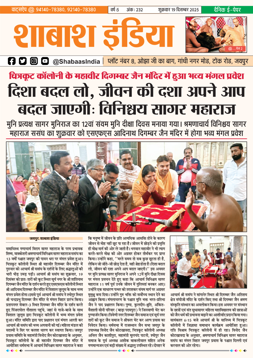 ePaper 19 Dec 2025 By shabaasindia December 18, 2025 0 0 Share FacebookTwitterPinterestWhatsApp 19-Dec-SI-Newspaper Related TagsFourth Features Share FacebookTwitterPinterestWhatsApp Previous article18 Dec 2025Next articleजीवन हमें खुशियों के इज़हार के लिए मिला है: राष्ट्रसंत मुनि सुधासागरजी महाराज - Advertisement - LEAVE A REPLY Cancel reply Comment: Please enter your comment! Name:* Please enter your name here Email:* You have entered an incorrect email address! Please enter your email address here Website: Save my name, email, and website in this browser for the next time I comment. Δ Latest article सटीक डायग्नोसिस ने दूर की भ्रांति, फीटल मेडिसिन विशेषज्ञ डॉ. आशीष चौधरी की जांच में स्पष्ट हुई शिशु की वास्तविक स्थिति March 1, 2026 भक्ति, एकता और अनुशासन का संगम: सावरदा में महासमिति का छठा मासिक पूजन विधान संपन्न February 28, 2026 सावरदा सिद्ध क्षेत्र में उमड़ा भक्ति का सैलाब: महासमिति का छठा मासिक पूजन विधान संपन्न February 24, 2026 शिवम दुबे का ‘हरफनमौला’ प्रहार: करियर का पहला विश्वकप अर्धशतक जड़ा; वरुण चक्रवर्ती की फिरकी में उलझी डच टीम February 18, 2026 भक्ति और उल्लास के साथ नव वर्ष का स्वागत: स्वस्तिक ग्रुप ने चूल्हिरी मंदिर में की पूजा-अर्चना February 4, 2026