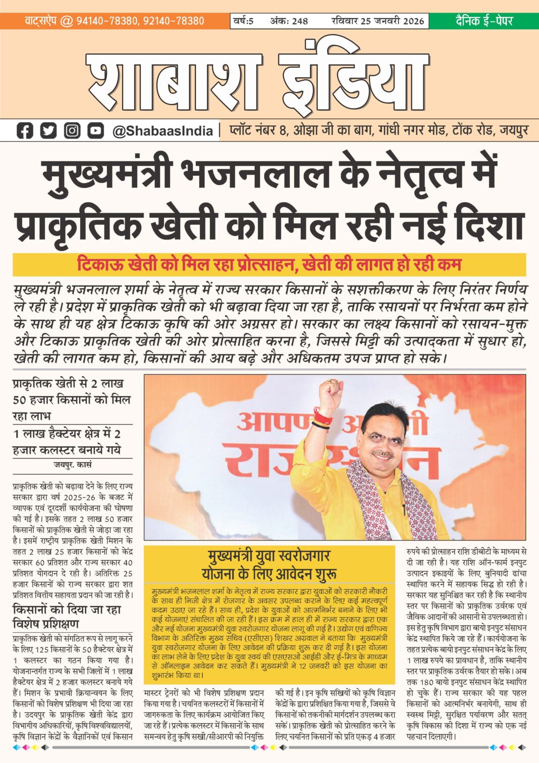ePaper 25 Jan 2026 By shabaasindia January 24, 2026 0 0 Share FacebookTwitterPinterestWhatsApp 25-JAN-2026-SI-NEWSPAPER Related TagsFourth Features Share FacebookTwitterPinterestWhatsApp Previous articleराजा ऋषभदेव ने राजपाठ त्याग कर जैनेश्वरी दीक्षा ग्रहण की: मुनि पुंगव सुधासागर महाराजNext articleकर्तव्य पथ पर दिखा हैरतअंगेज नजारा: पहली बार दो कूबड़ वाले ऊंटों और शिकारी बाजों ने भरी हुंकार - Advertisement - LEAVE A REPLY Cancel reply Comment: Please enter your comment! Name:* Please enter your name here Email:* You have entered an incorrect email address! Please enter your email address here Website: Save my name, email, and website in this browser for the next time I comment. Δ Latest article सटीक डायग्नोसिस ने दूर की भ्रांति, फीटल मेडिसिन विशेषज्ञ डॉ. आशीष चौधरी की जांच में स्पष्ट हुई शिशु की वास्तविक स्थिति March 1, 2026 भक्ति, एकता और अनुशासन का संगम: सावरदा में महासमिति का छठा मासिक पूजन विधान संपन्न February 28, 2026 सावरदा सिद्ध क्षेत्र में उमड़ा भक्ति का सैलाब: महासमिति का छठा मासिक पूजन विधान संपन्न February 24, 2026 शिवम दुबे का ‘हरफनमौला’ प्रहार: करियर का पहला विश्वकप अर्धशतक जड़ा; वरुण चक्रवर्ती की फिरकी में उलझी डच टीम February 18, 2026 भक्ति और उल्लास के साथ नव वर्ष का स्वागत: स्वस्तिक ग्रुप ने चूल्हिरी मंदिर में की पूजा-अर्चना February 4, 2026