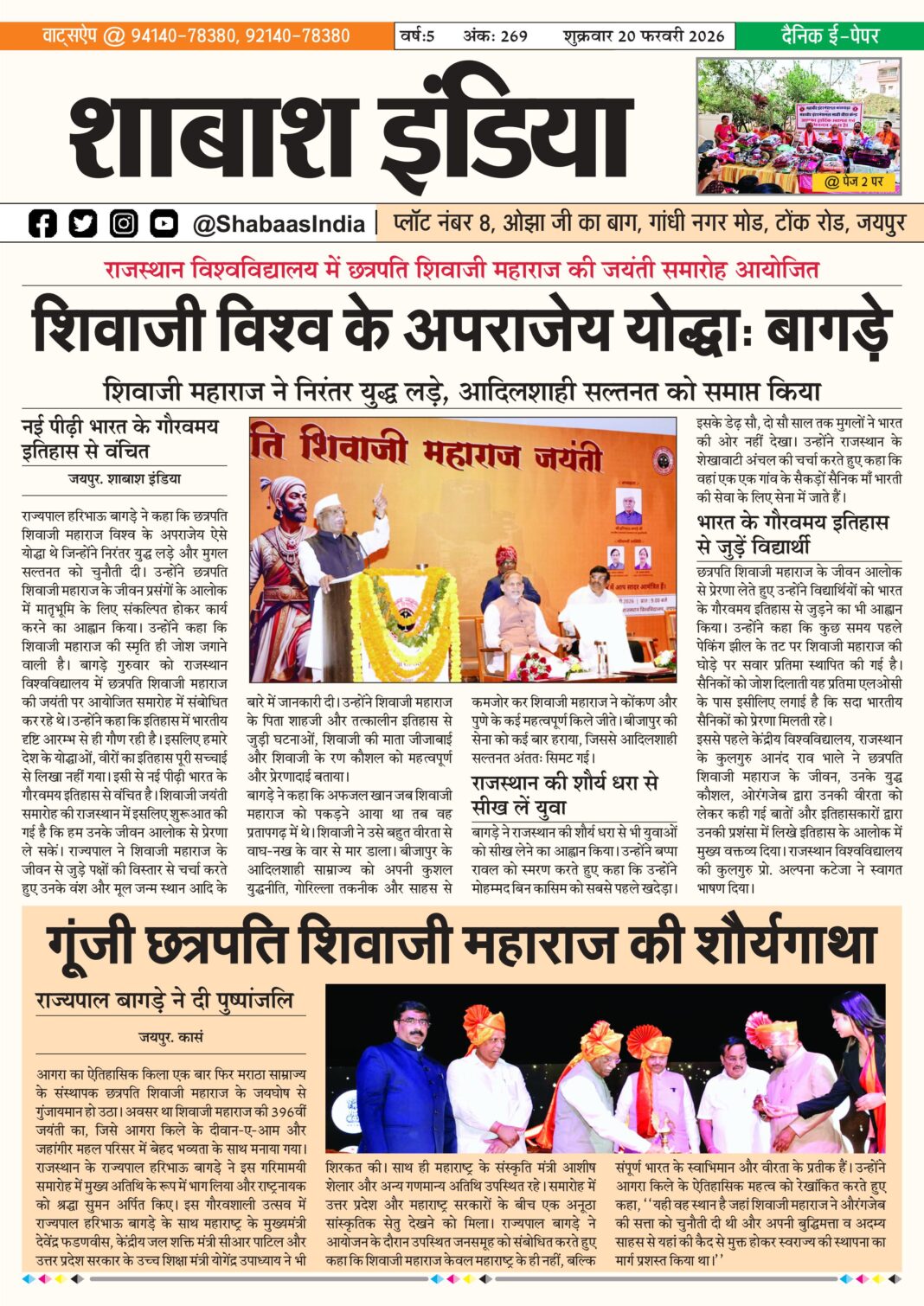 ePaper 20 Feb 2026 By shabaasindia February 19, 2026 0 0 Share FacebookTwitterPinterestWhatsApp 20-Feb-SI-Newspaper Related TagsFourth Features Share FacebookTwitterPinterestWhatsApp Previous articleशिवम दुबे का ‘हरफनमौला’ प्रहार: करियर का पहला विश्वकप अर्धशतक जड़ा; वरुण चक्रवर्ती की फिरकी में उलझी डच टीमNext article21 Feb 2026 - Advertisement - LEAVE A REPLY Cancel reply Comment: Please enter your comment! Name:* Please enter your name here Email:* You have entered an incorrect email address! Please enter your email address here Website: Save my name, email, and website in this browser for the next time I comment. Δ Latest article सटीक डायग्नोसिस ने दूर की भ्रांति, फीटल मेडिसिन विशेषज्ञ डॉ. आशीष चौधरी की जांच में स्पष्ट हुई शिशु की वास्तविक स्थिति March 1, 2026 भक्ति, एकता और अनुशासन का संगम: सावरदा में महासमिति का छठा मासिक पूजन विधान संपन्न February 28, 2026 सावरदा सिद्ध क्षेत्र में उमड़ा भक्ति का सैलाब: महासमिति का छठा मासिक पूजन विधान संपन्न February 24, 2026 शिवम दुबे का ‘हरफनमौला’ प्रहार: करियर का पहला विश्वकप अर्धशतक जड़ा; वरुण चक्रवर्ती की फिरकी में उलझी डच टीम February 18, 2026 भक्ति और उल्लास के साथ नव वर्ष का स्वागत: स्वस्तिक ग्रुप ने चूल्हिरी मंदिर में की पूजा-अर्चना February 4, 2026