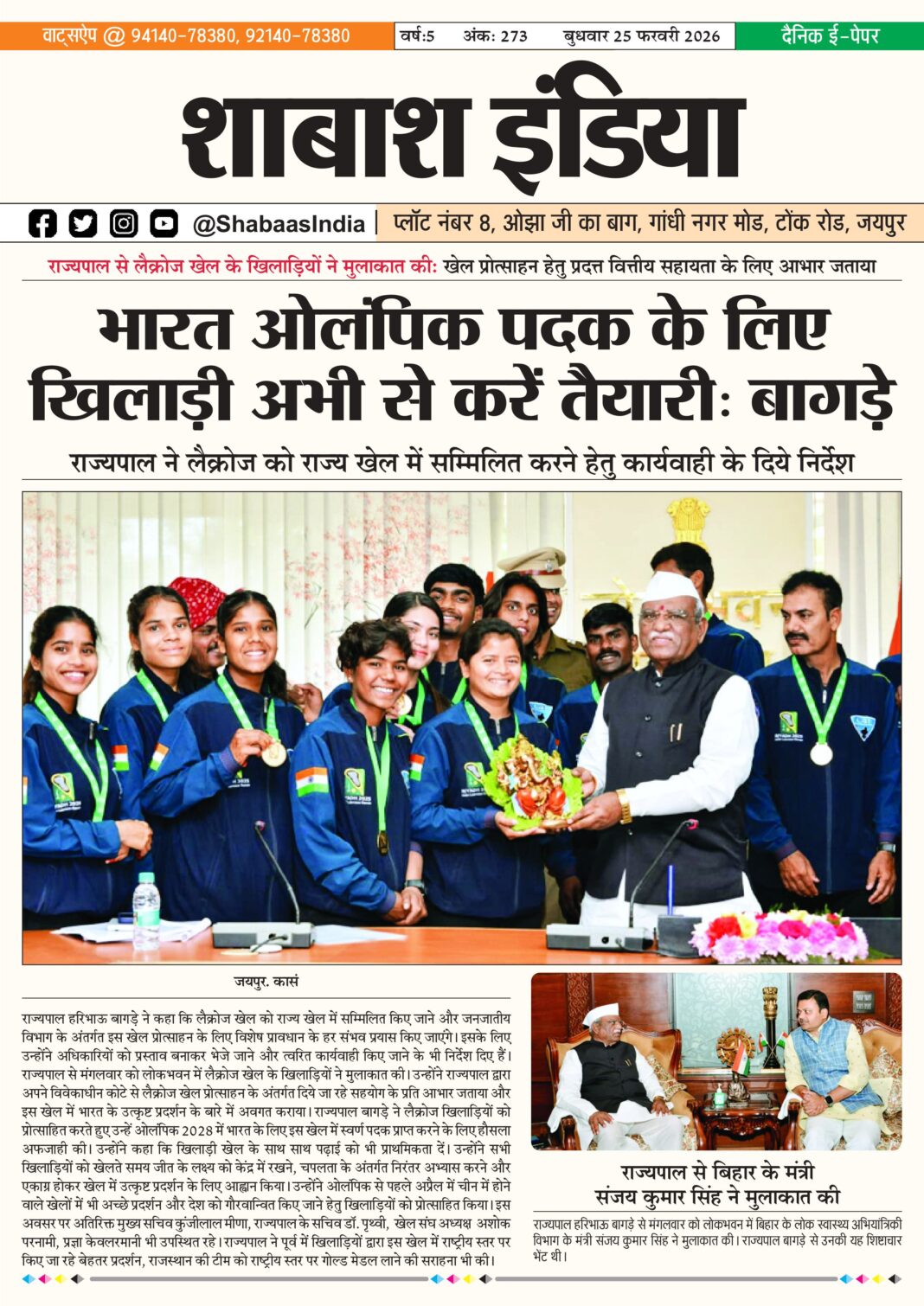 ePaper 25 Feb 2026 By shabaasindia February 24, 2026 0 0 Share FacebookTwitterPinterestWhatsApp 25-Feb-SI-Newspaper Related TagsFourth Features Share FacebookTwitterPinterestWhatsApp Previous article24 Feb 2026Next articleसावरदा सिद्ध क्षेत्र में उमड़ा भक्ति का सैलाब: महासमिति का छठा मासिक पूजन विधान संपन्न - Advertisement - LEAVE A REPLY Cancel reply Comment: Please enter your comment! Name:* Please enter your name here Email:* You have entered an incorrect email address! Please enter your email address here Website: Save my name, email, and website in this browser for the next time I comment. Δ Latest article सटीक डायग्नोसिस ने दूर की भ्रांति, फीटल मेडिसिन विशेषज्ञ डॉ. आशीष चौधरी की जांच में स्पष्ट हुई शिशु की वास्तविक स्थिति March 1, 2026 भक्ति, एकता और अनुशासन का संगम: सावरदा में महासमिति का छठा मासिक पूजन विधान संपन्न February 28, 2026 सावरदा सिद्ध क्षेत्र में उमड़ा भक्ति का सैलाब: महासमिति का छठा मासिक पूजन विधान संपन्न February 24, 2026 शिवम दुबे का ‘हरफनमौला’ प्रहार: करियर का पहला विश्वकप अर्धशतक जड़ा; वरुण चक्रवर्ती की फिरकी में उलझी डच टीम February 18, 2026 भक्ति और उल्लास के साथ नव वर्ष का स्वागत: स्वस्तिक ग्रुप ने चूल्हिरी मंदिर में की पूजा-अर्चना February 4, 2026