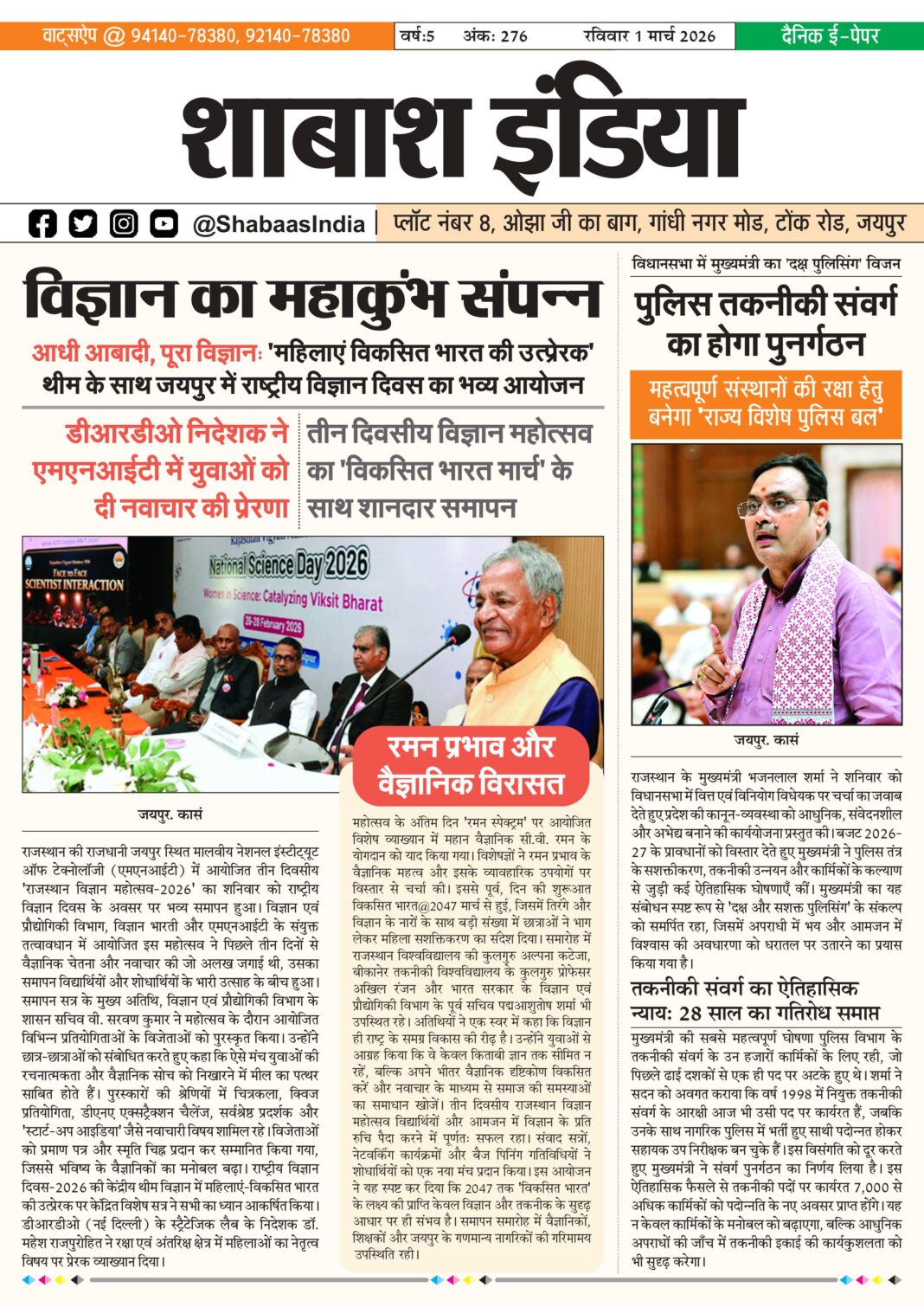 ePaper 1 March 2026 By shabaasindia February 28, 2026 0 0 Share FacebookTwitterPinterestWhatsApp 1-March-SI-Newspaper Related TagsFourth Features Share FacebookTwitterPinterestWhatsApp Previous articleभक्ति, एकता और अनुशासन का संगम: सावरदा में महासमिति का छठा मासिक पूजन विधान संपन्नNext articleसटीक डायग्नोसिस ने दूर की भ्रांति, फीटल मेडिसिन विशेषज्ञ डॉ. आशीष चौधरी की जांच में स्पष्ट हुई शिशु की वास्तविक स्थिति - Advertisement - LEAVE A REPLY Cancel reply Comment: Please enter your comment! Name:* Please enter your name here Email:* You have entered an incorrect email address! Please enter your email address here Website: Save my name, email, and website in this browser for the next time I comment. Δ Latest article सटीक डायग्नोसिस ने दूर की भ्रांति, फीटल मेडिसिन विशेषज्ञ डॉ. आशीष चौधरी की जांच में स्पष्ट हुई शिशु की वास्तविक स्थिति March 1, 2026 भक्ति, एकता और अनुशासन का संगम: सावरदा में महासमिति का छठा मासिक पूजन विधान संपन्न February 28, 2026 सावरदा सिद्ध क्षेत्र में उमड़ा भक्ति का सैलाब: महासमिति का छठा मासिक पूजन विधान संपन्न February 24, 2026 शिवम दुबे का ‘हरफनमौला’ प्रहार: करियर का पहला विश्वकप अर्धशतक जड़ा; वरुण चक्रवर्ती की फिरकी में उलझी डच टीम February 18, 2026 भक्ति और उल्लास के साथ नव वर्ष का स्वागत: स्वस्तिक ग्रुप ने चूल्हिरी मंदिर में की पूजा-अर्चना February 4, 2026