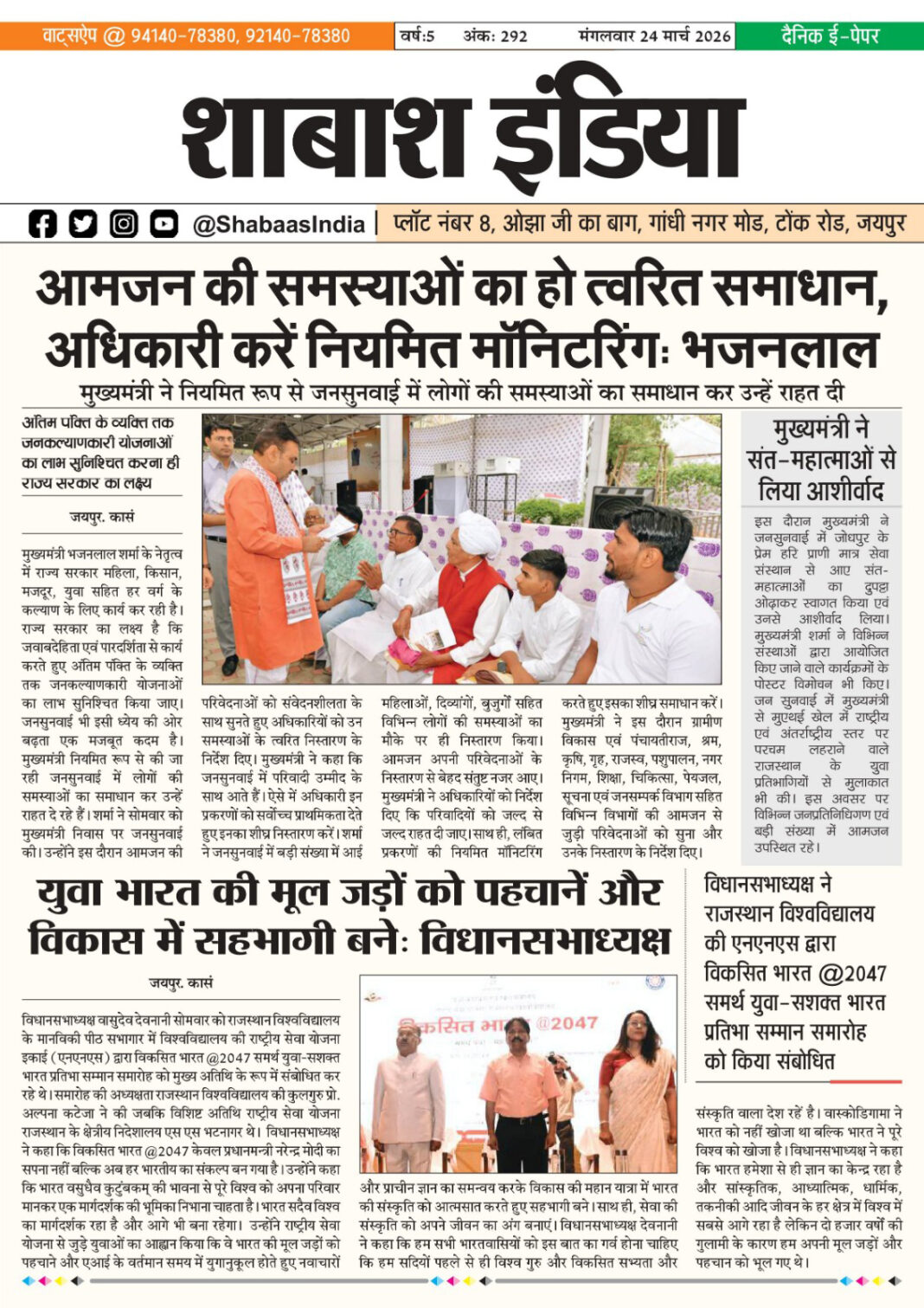 ePaper 24 March 2026 By shabaasindia March 24, 2026 0 0 Share FacebookTwitterPinterestWhatsApp 24-March-SI-Newspaper Related TagsFourth Features Share FacebookTwitterPinterestWhatsApp Previous articleहौसलों की उड़ान: जोया ने 87.50% अंकों के साथ हासिल की उपलब्धि, फूड प्रोसेसिंग में बटोरे रिकॉर्ड 95 अंकNext article25 March 2026 - Advertisement - LEAVE A REPLY Cancel reply Comment: Please enter your comment! Name:* Please enter your name here Email:* You have entered an incorrect email address! Please enter your email address here Website: Save my name, email, and website in this browser for the next time I comment. Δ Latest article ठोलियान मंदिर में श्रीजी नवीन वेदी में विराजमान, शिखर पर कलश एवं ध्वजा स्थापना April 22, 2026 आचार्य प्रज्ञासागर जी का जवाहर नगर में भव्य मंगल प्रवेश; युवा पीढ़ी को संस्कारों से जोड़ने का आह्वान April 13, 2026 अनंत अंबानी के ‘वनतारा’ ने वन्यजीव और पशु चिकित्सा विज्ञान के लिए दुनिया की पहली वैश्विक यूनिवर्सिटी की घोषणा की April 10, 2026 समाज भूषण स्वर्गीय श्री राजेंद्र जी गोधा स्मृति ‘पंचम जीवन रक्षक सम्मान समारोह’ रविवार 5 अप्रैल को April 3, 2026 इरादे हों बुलंद तो मुमकिन है हर मंजिल: परी खान की शानदार कामयाबी से परिवार में जश्न March 31, 2026