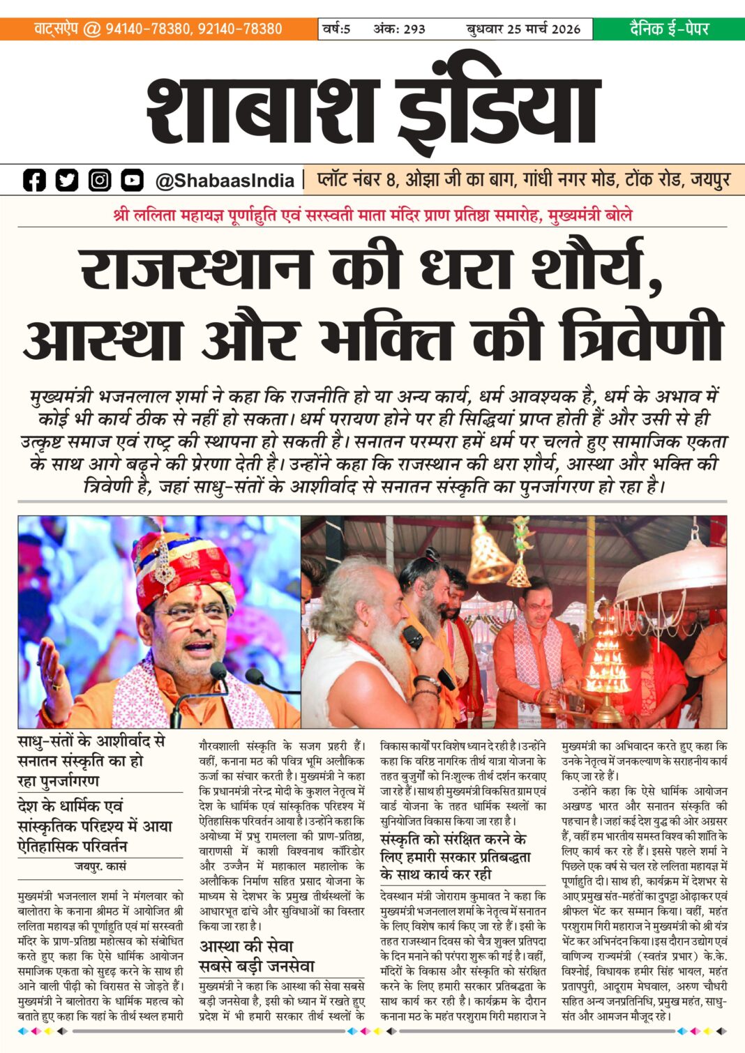 ePaper 25 March 2026 By shabaasindia March 24, 2026 0 0 Share FacebookTwitterPinterestWhatsApp 25-March-SI-Newspaper-1 Related TagsFourth Featuresnews Share FacebookTwitterPinterestWhatsApp Previous article24 March 2026Next article26 March 2026 - Advertisement - LEAVE A REPLY Cancel reply Comment: Please enter your comment! Name:* Please enter your name here Email:* You have entered an incorrect email address! Please enter your email address here Website: Save my name, email, and website in this browser for the next time I comment. Δ Latest article ठोलियान मंदिर में श्रीजी नवीन वेदी में विराजमान, शिखर पर कलश एवं ध्वजा स्थापना April 22, 2026 आचार्य प्रज्ञासागर जी का जवाहर नगर में भव्य मंगल प्रवेश; युवा पीढ़ी को संस्कारों से जोड़ने का आह्वान April 13, 2026 अनंत अंबानी के ‘वनतारा’ ने वन्यजीव और पशु चिकित्सा विज्ञान के लिए दुनिया की पहली वैश्विक यूनिवर्सिटी की घोषणा की April 10, 2026 समाज भूषण स्वर्गीय श्री राजेंद्र जी गोधा स्मृति ‘पंचम जीवन रक्षक सम्मान समारोह’ रविवार 5 अप्रैल को April 3, 2026 इरादे हों बुलंद तो मुमकिन है हर मंजिल: परी खान की शानदार कामयाबी से परिवार में जश्न March 31, 2026