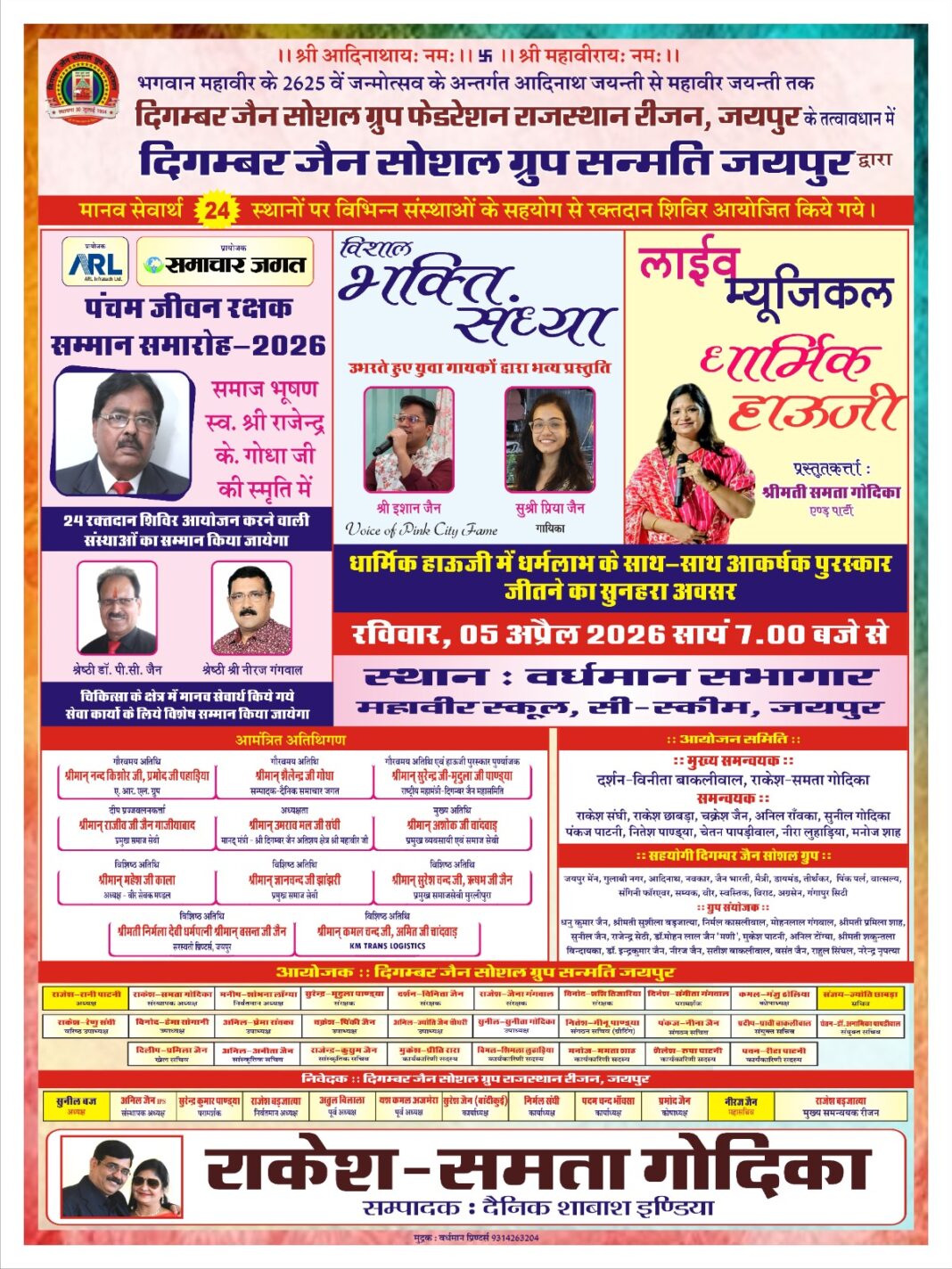 जयपुर: दिगंबर जैन सोशल ग्रुप फेडरेशन (राजस्थान रीजन) के तत्वावधान में दिगंबर जैन सोशल ग्रुप सन्मति द्वारा रविवार, 5 अप्रैल 2026 को एक भव्य सम्मान समारोह और भक्ति संध्या का आयोजन किया जा रहा है। यह कार्यक्रम समाज भूषण स्वर्गीय श्री राजेंद्र जी गोधा की पावन स्मृति में आयोजित किया जाएगा।