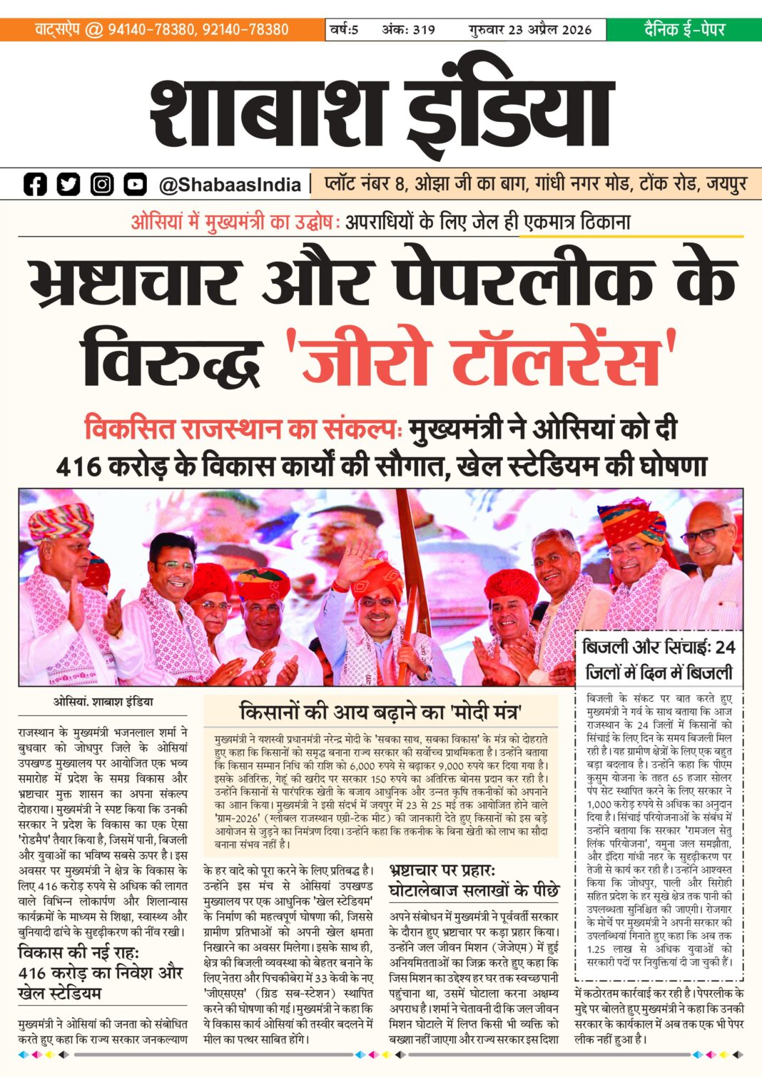 ePaper 23 April 2026 By shabaasindia April 22, 2026 0 0 Share FacebookTwitterPinterestWhatsApp 23-April-SI-Newspaper Related TagsFourth Features Share FacebookTwitterPinterestWhatsApp Previous article21 April 2026Next articleठोलियान मंदिर में श्रीजी नवीन वेदी में विराजमान, शिखर पर कलश एवं ध्वजा स्थापना - Advertisement - LEAVE A REPLY Cancel reply Comment: Please enter your comment! Name:* Please enter your name here Email:* You have entered an incorrect email address! Please enter your email address here Website: Save my name, email, and website in this browser for the next time I comment. Δ Latest article ठोलियान मंदिर में श्रीजी नवीन वेदी में विराजमान, शिखर पर कलश एवं ध्वजा स्थापना April 22, 2026 आचार्य प्रज्ञासागर जी का जवाहर नगर में भव्य मंगल प्रवेश; युवा पीढ़ी को संस्कारों से जोड़ने का आह्वान April 13, 2026 अनंत अंबानी के ‘वनतारा’ ने वन्यजीव और पशु चिकित्सा विज्ञान के लिए दुनिया की पहली वैश्विक यूनिवर्सिटी की घोषणा की April 10, 2026 समाज भूषण स्वर्गीय श्री राजेंद्र जी गोधा स्मृति ‘पंचम जीवन रक्षक सम्मान समारोह’ रविवार 5 अप्रैल को April 3, 2026 इरादे हों बुलंद तो मुमकिन है हर मंजिल: परी खान की शानदार कामयाबी से परिवार में जश्न March 31, 2026
